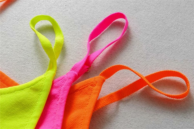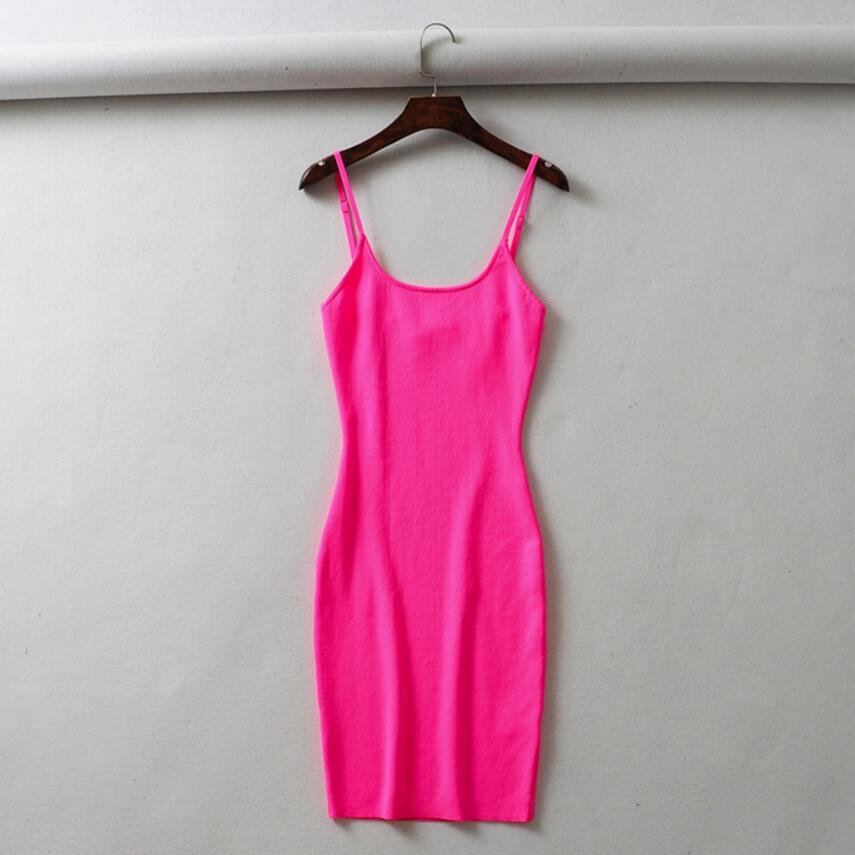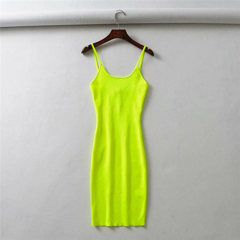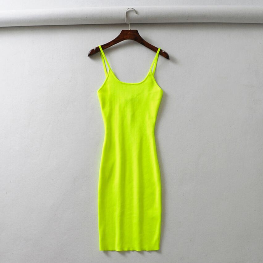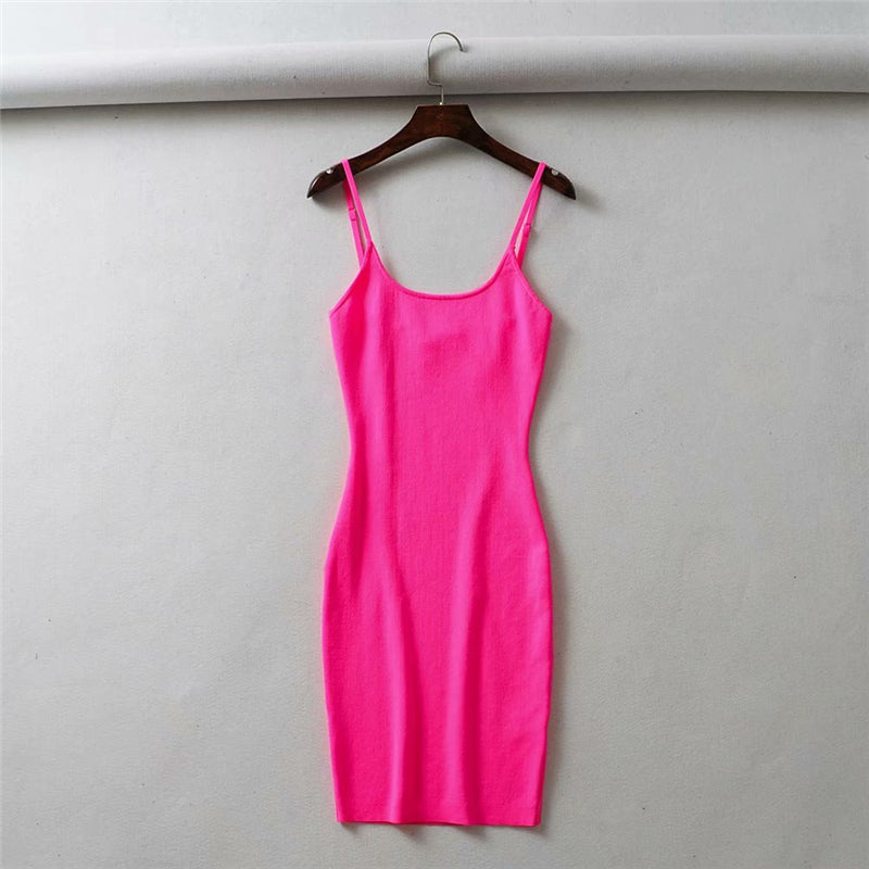 LUNDUNSHIJIA Fluorescence Stretch Knitting Mini Dress Women Sexy Straps Slim Fit Party Dresses Vestidos Femme